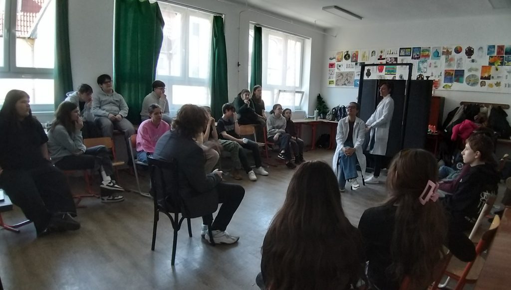 Iskolánk 7. évfolyamos tanulói különleges programon vehettek részt: a Csokonai Nemzeti Színház színészei tartottak számukra interaktív vitaszínházi előadást. A „OnLife” című előadás középpontjában egy mindannyiunkat érintő, aktuális kérdés állt: milyen hatással vannak életünkre a digitális eszközök, az online tér és a mesterséges intelligencia.